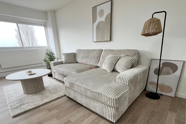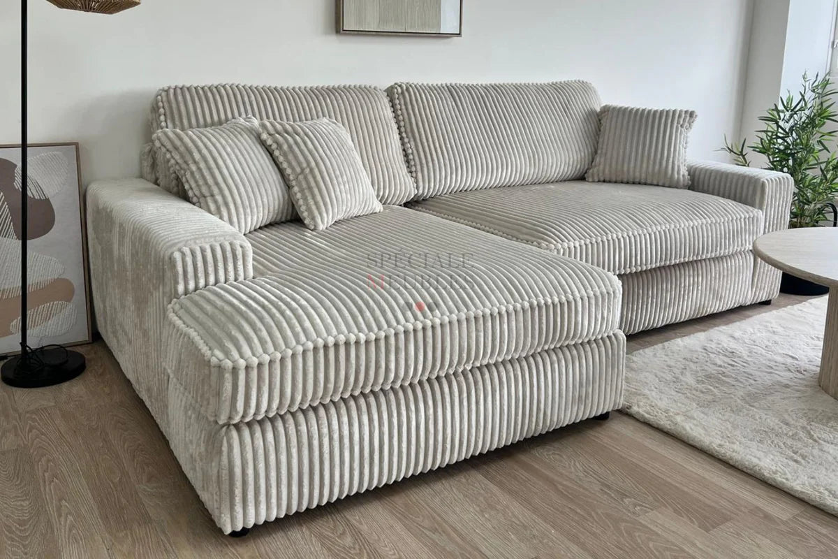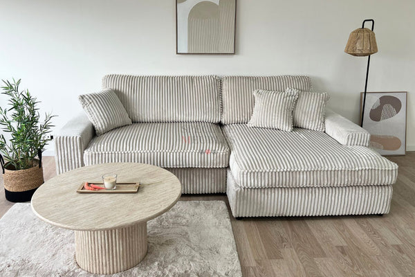 - Revêtement : tissu en grosse côte (côtelé) – blanc cassé, une texture chaleureuse et tendance, douce au toucher, qui apporte un cachet unique à votre salon. Le coloris blanc cassé s’intègre facilement à tous les styles de décoration.