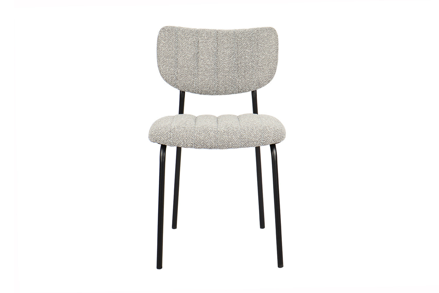 Chaise design au style moderne, avec assise rembourrée en tissu Ote et piétement en métal noir. Confortable, légère et disponible en plusieurs couleurs.