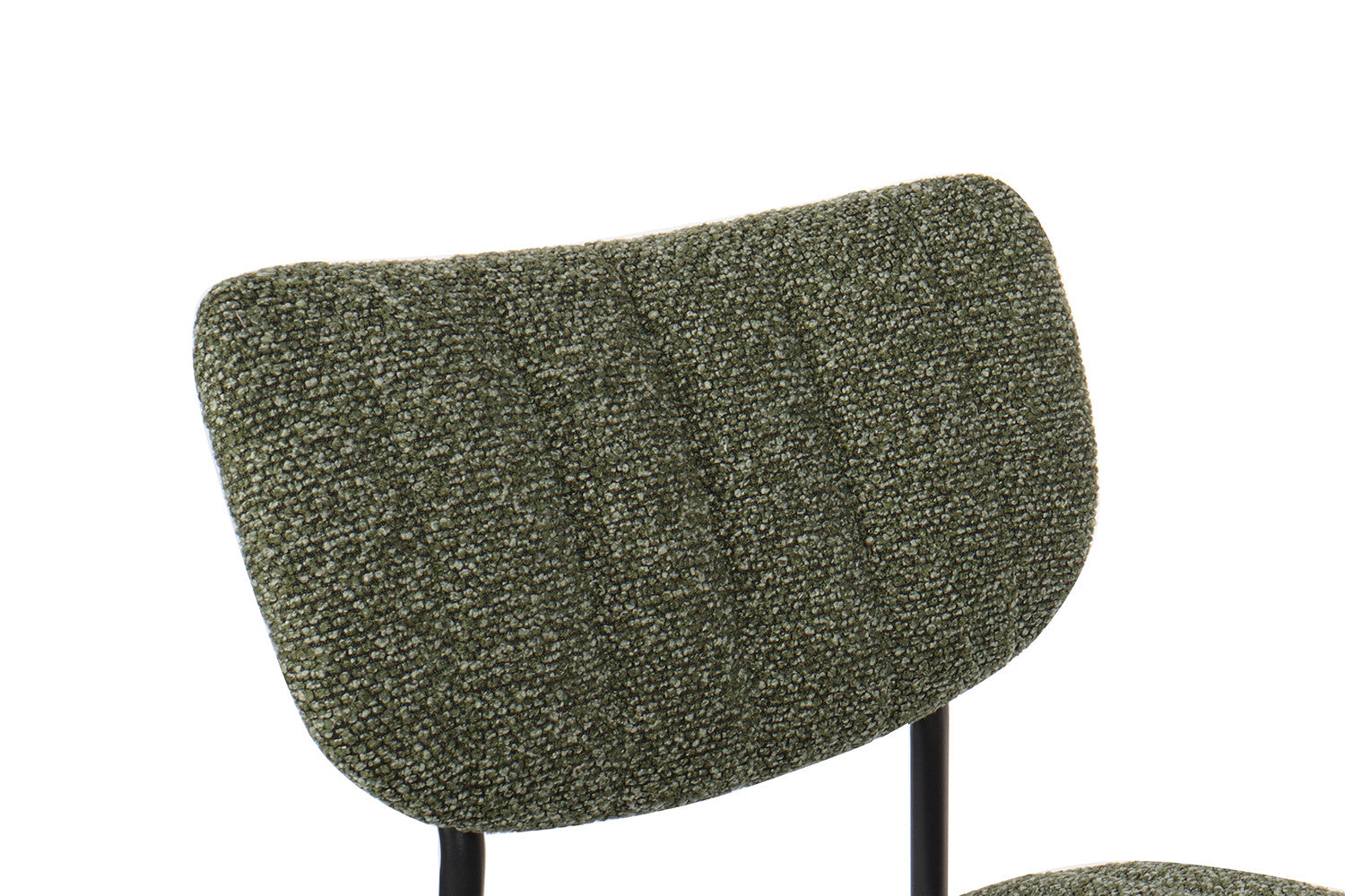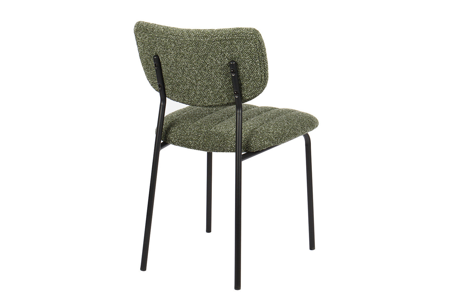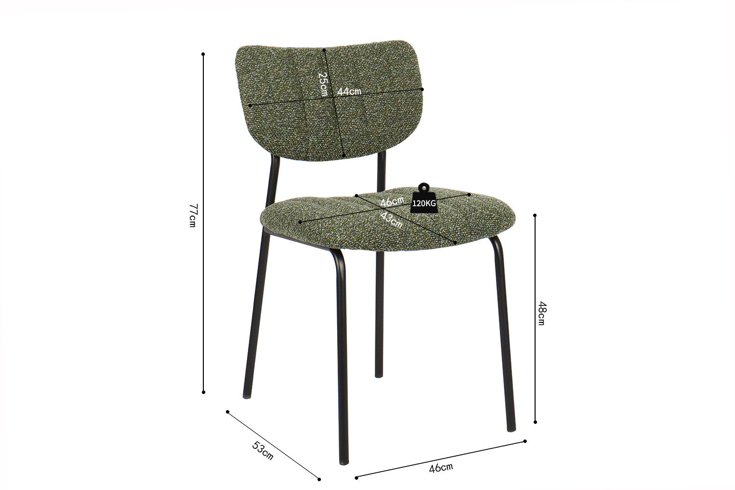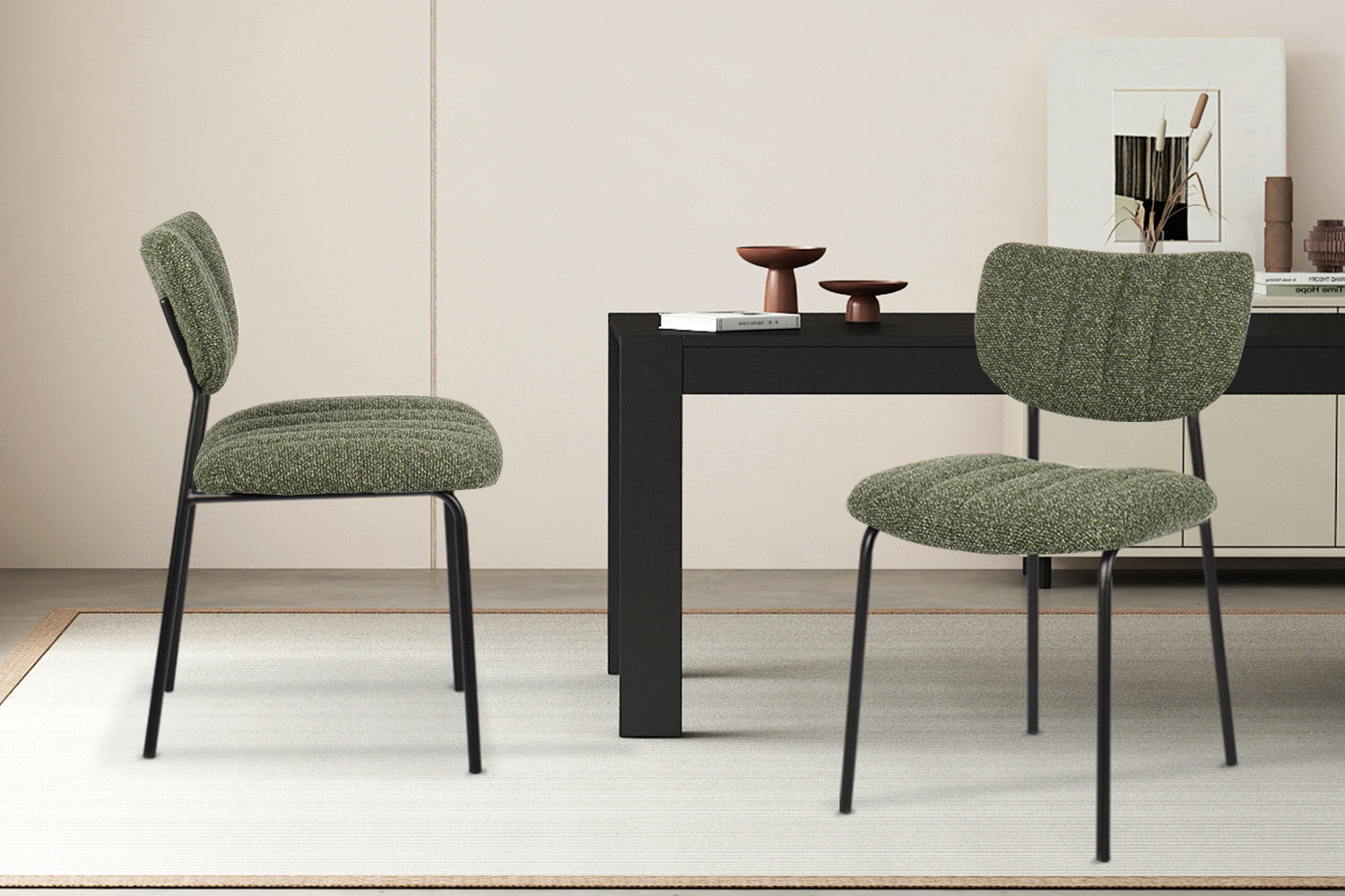 Chaise design au style moderne, avec assise rembourrée en tissu Ote et piétement en métal noir. Confortable, légère et disponible en plusieurs couleurs.