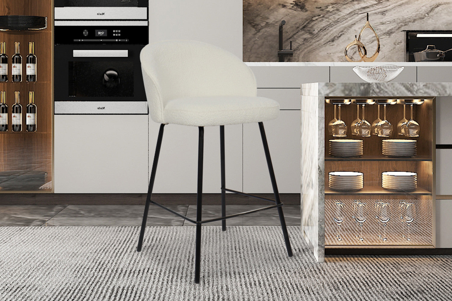 Le tabouret de bar Juta séduit par son design contemporain et son confort enveloppant. Son tissu en laine bouclée, doux et tendance, apporte une touche chaleureuse et élégante. Le piètement en métal assure stabilité et solidité, tout en soulignant une ligne moderne, idéale pour un bar ou un îlot de cuisine.
