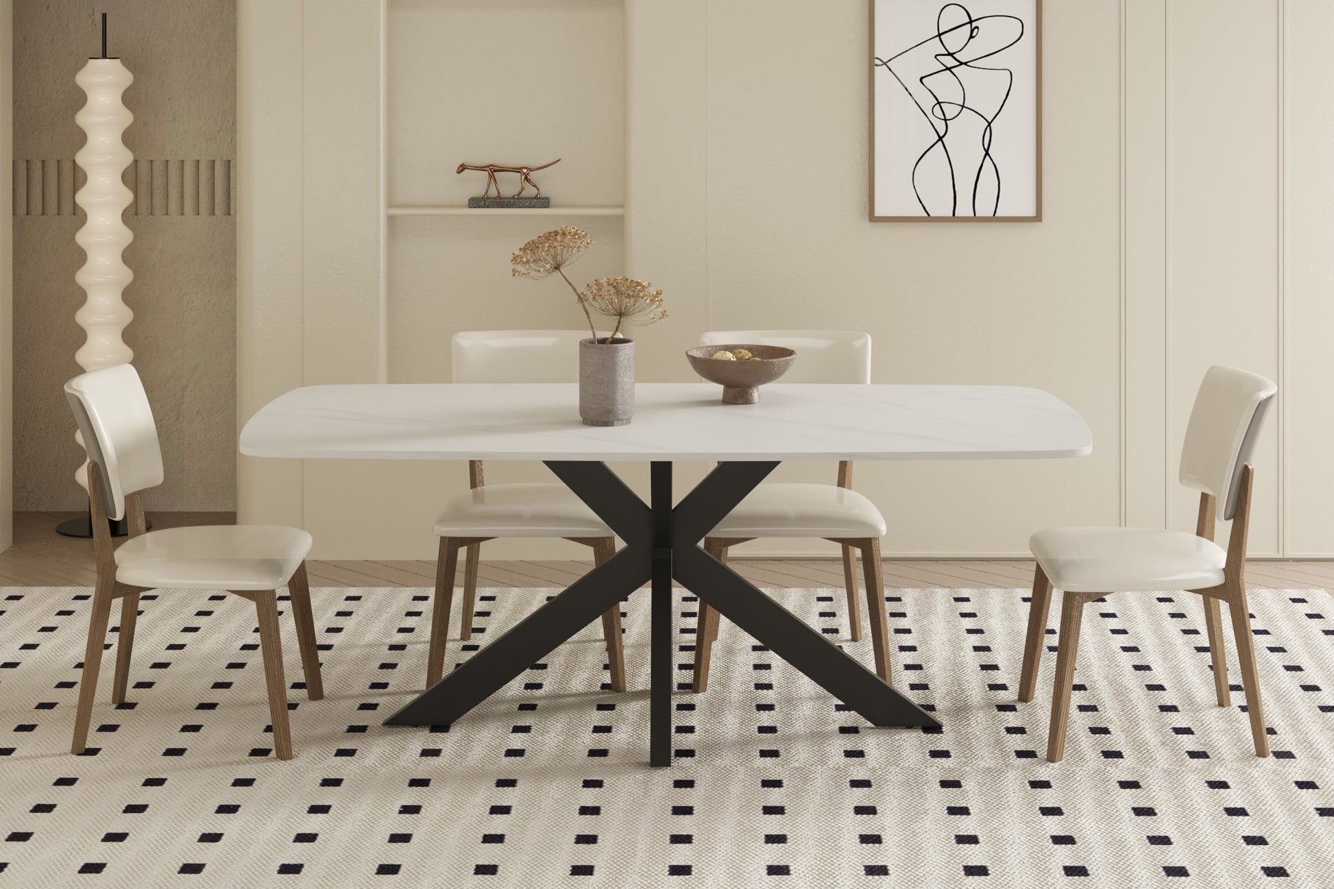 Cette table incarne le style contemporain minimaliste, avec une forme ovale danoise qui adoucit les angles d’un espace de salle à manger. Le plateau effet pierre blanche et les marbrures beige lui confèrent une allure élégante et lumineuse, tandis que le piètement noir métallique apporte un contraste moderne et structurant.